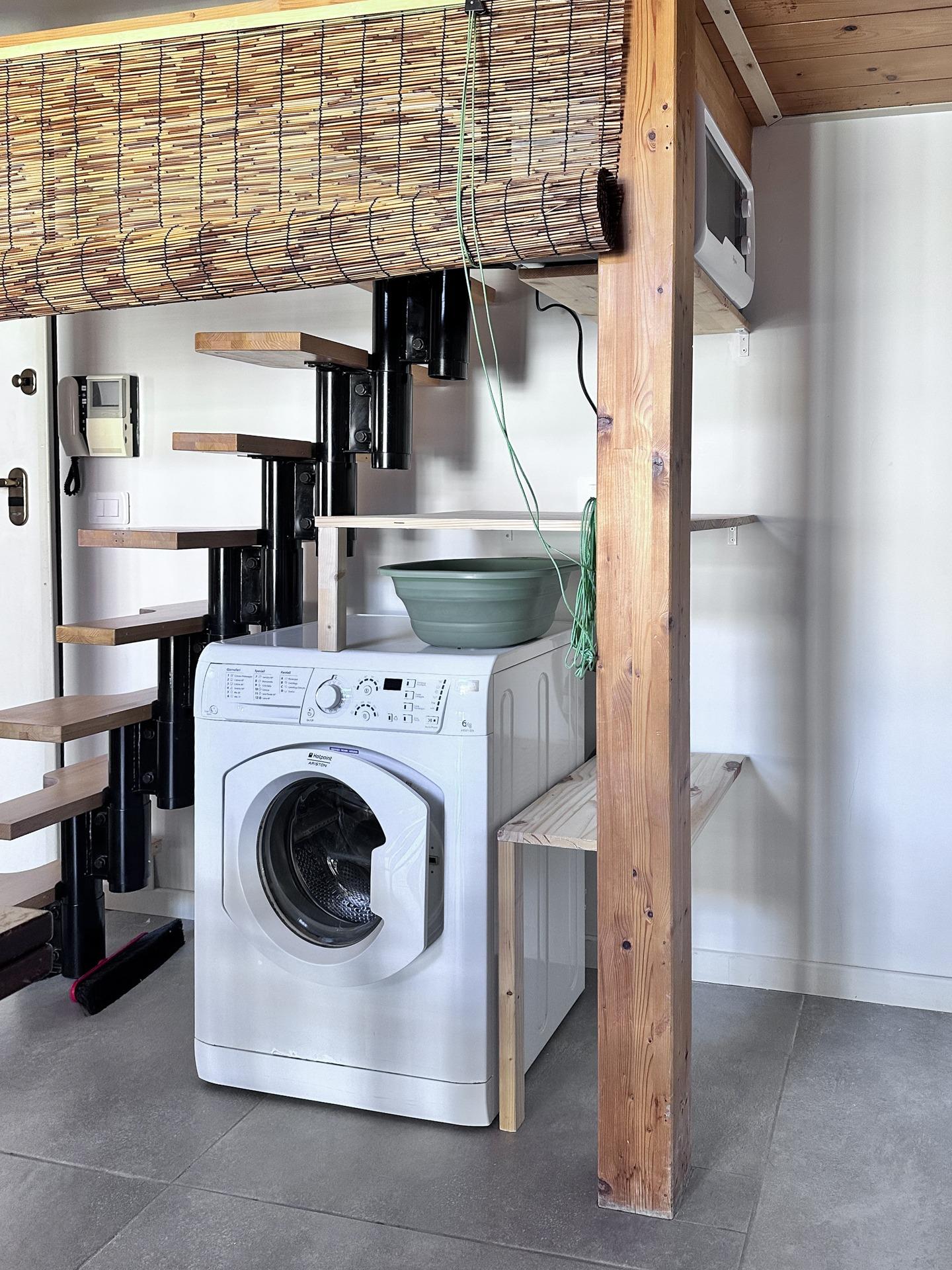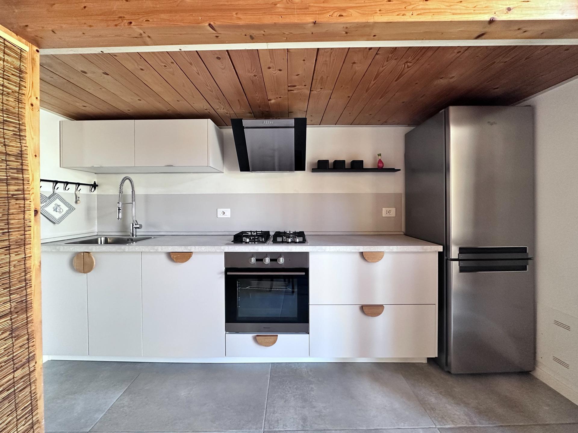 Cucina e sala da pranzo con accesso al terrazzino coperto e scale per la camera soppalcata